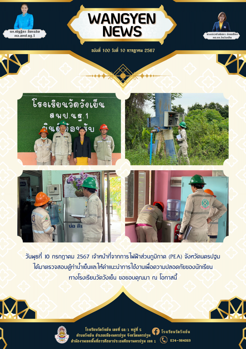 จดหมายข่าว ประชาสัมพันธ์ โรงเรียนวัดวังเย็น เรื่อง เจ้าหน้าที่จากการไฟฟ้าส่วนภูมิภาค (PEA) จังหวัดนครปฐมได้มาตรวจสอบตู้ทำน้ำเย็นแล:ให้คำแนะนำการใช้งานเพื่อความปลอดภัยของนักเรียน ทางโรงเรียนวัดวังเย็น