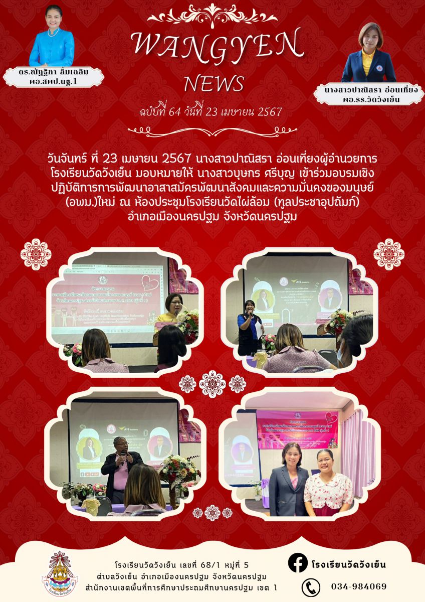 จดหมายข่าว ประชาสัมพันธ์ โรงเรียนวัดวังเย็น เรื่อง ครูเข้าร่วมอบรมเชิงปฏิบัติการการพัฒนาอาสาสมัครพัฒนาสังคมและความมั่นคงของมนุษย์ (อพม.)ใหม่