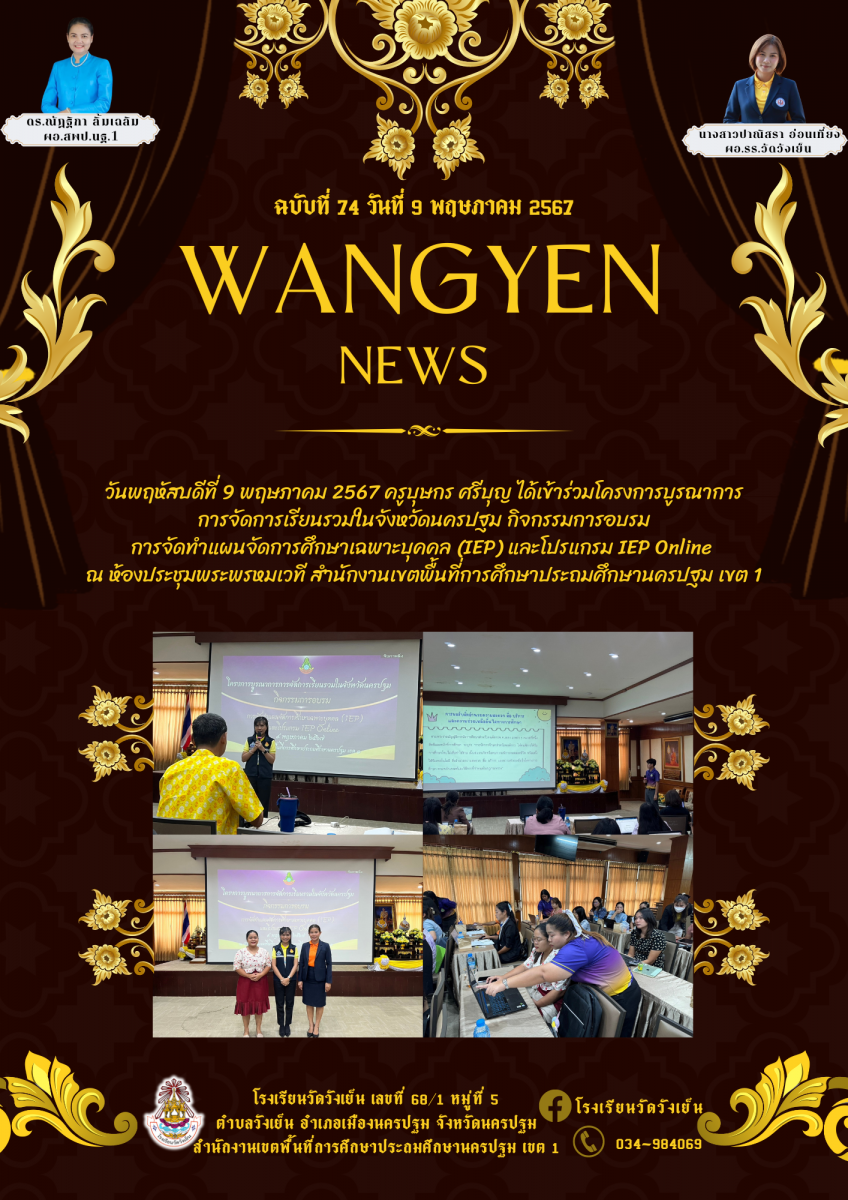 จดหมายข่าว ประชาสัมพันธ์ โรงเรียนวัดวังเย็น เรื่อง ครูบุษกร ศรีบุญ ได้เข้าร่วมโครงการบูรณาการ การจัดการเรียนรวมในจังหวัดนครปฐม กิจกรรมการอบรม การจัดทำแผนจัดการศึกษาเฉพาะบุคคล (IEP) และโปรแกรม IEP Onli