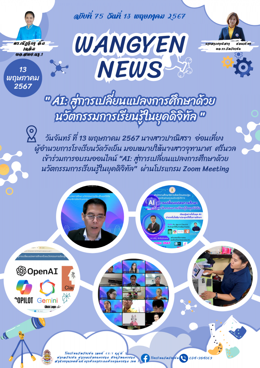 จดหมายข่าว ประชาสัมพันธ์ โรงเรียนวัดวังเย็น เรื่อง ครูจุฑามาศ ศรีนวล เข้าร่วมการอบรมออนไลน์ "AI: สู่การเปลี่ยนแปลงการศึกษาด้วยนวัตกรรมการเรียนรู้ในยุคดิจิทัล"