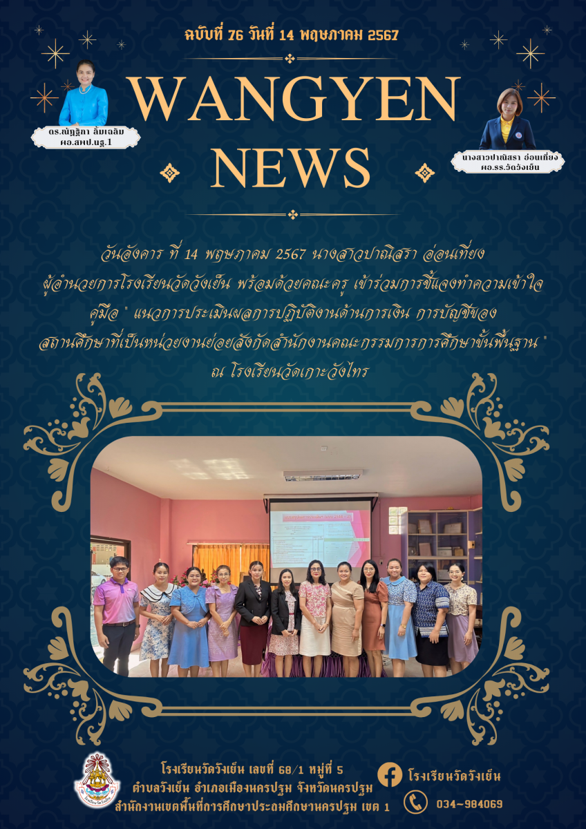จดหมายข่าว ประชาสัมพันธ์ โรงเรียนวัดวังเย็น เรื่อง ผู้อำนวยการโรงเรียนวัดวังเย็น พร้อมด้วยคณะครู เข้าร่วมการชี้แจงทำความเข้าใจคู่มือ " แนวการประเมินผลการปฏิบัติงานด้านการเงิน การบัญชีของ สถานศึกษาที่เ
