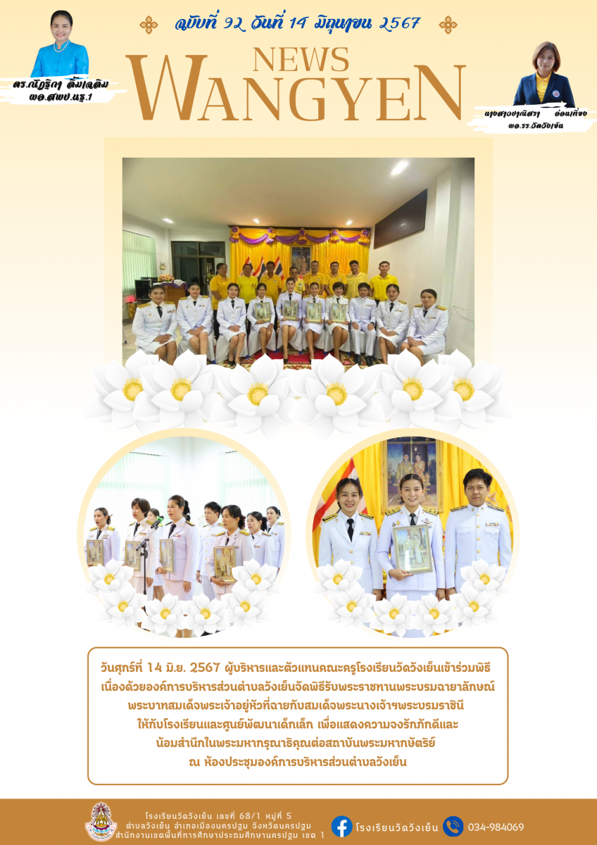 จดหมายข่าว ประชาสัมพันธ์ โรงเรียนวัดวังเย็น เรื่อง ผู้บริหารและตัวแทนคณะครูโรงเรียนวัดวังเย็นเข้าร่วมพิธีรับพระราชทานพระบรมฉายาลักษณ์พระบาทสมเด็จพระเจ้าอยู่หัวที่ฉายกับสมเด็จพระนางเจ้าฯพระบรมราชินี