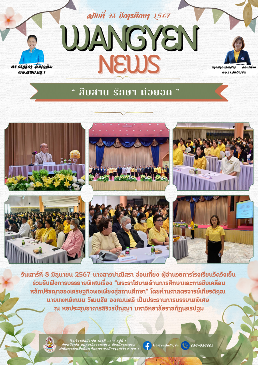 จดหมายข่าว ประชาสัมพันธ์ โรงเรียนวัดวังเย็น เรื่อง ผู้อำนวยการโรงเรียนวัดวังเย็น ร่วมรับฟังการบรรยายพิเศษเรื่อง ?พระราโชบายด้านการศึกษาและการขับเคลื่อน หลักปรัชญาของเศรษฐกิจพอเพียงสู่สถานศึกษา?